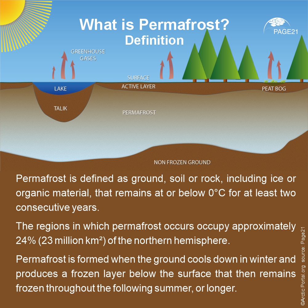 Permafrost is defined as ground, soil, or rock, including ice or organic material, that remains at or below 0°C for at least two consecutive years. The regions in which permafrost occurs occupy approximately 24% (23 million km²) of the northern hemisphere. Permafrost is formed when the ground cools down in winter and produces a frozen layer below the surface that then remains frozen throughout the following summer, or longer (Click on the images to view a Quick fact about permafrost and permafrost thaw).